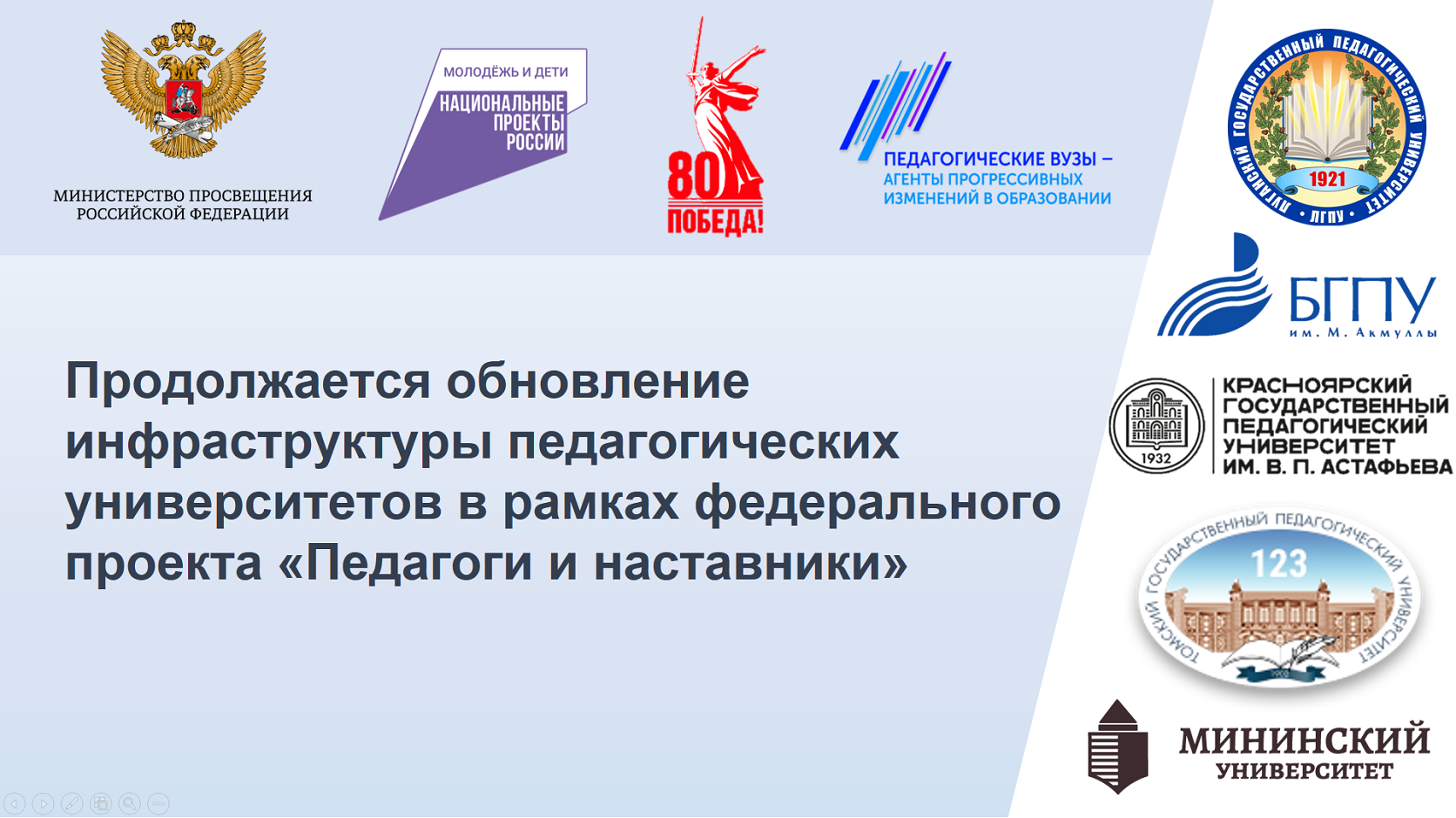 Педагогические университеты страны активно участвуют в реализации федерального проекта «Педагоги и наставники» национального проекта «Молодёжь и дети». Особое внимание, конечно, уделяется обновлению инфраструктуры.