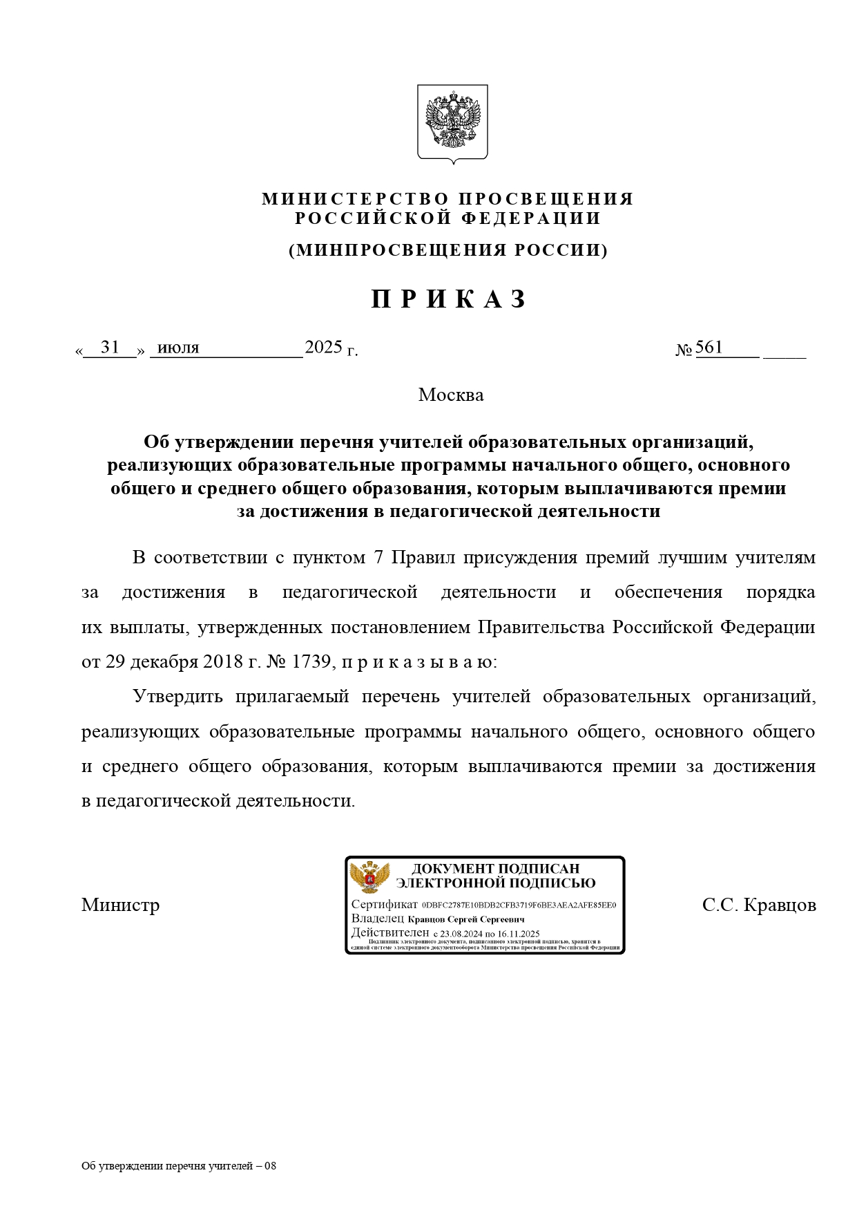 Приказ об утверждении перечня награждённых — учителей образовательных организаций, реализующих образовательные программы начального общего, основного общего и среднего общего образования издан Минпросвещения России.