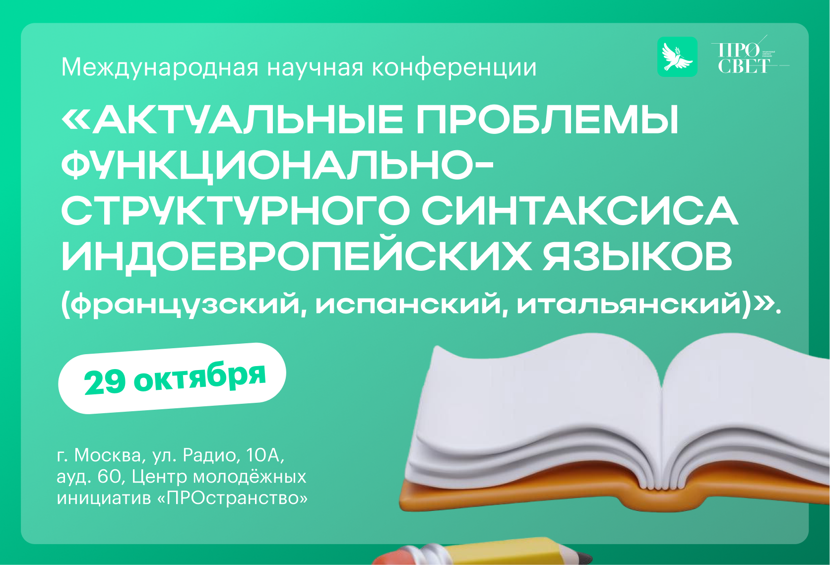 Конференция пройдет 29 октября по адресу: г. Москва, ул. Радио, 10А, ауд. 60, Центр молодёжных инициатив «ПРОстранство».