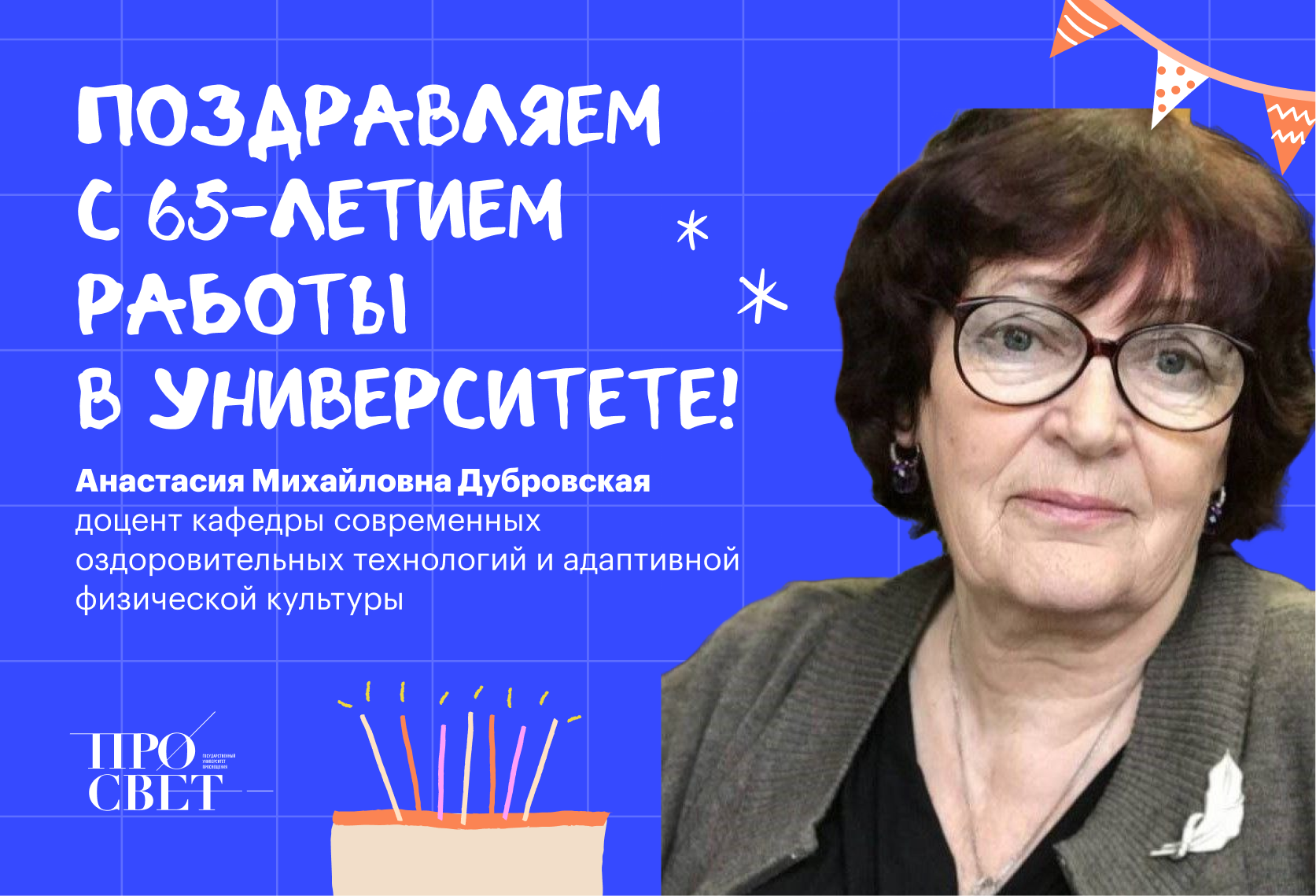 25 сентября отмечает 65 лет плодотворной трудовой деятельности в стенах нашего Университета преподаватель кафедры современных оздоровительных технологий и адаптивной физической культуры Анастасия Михайловна Дубровская.