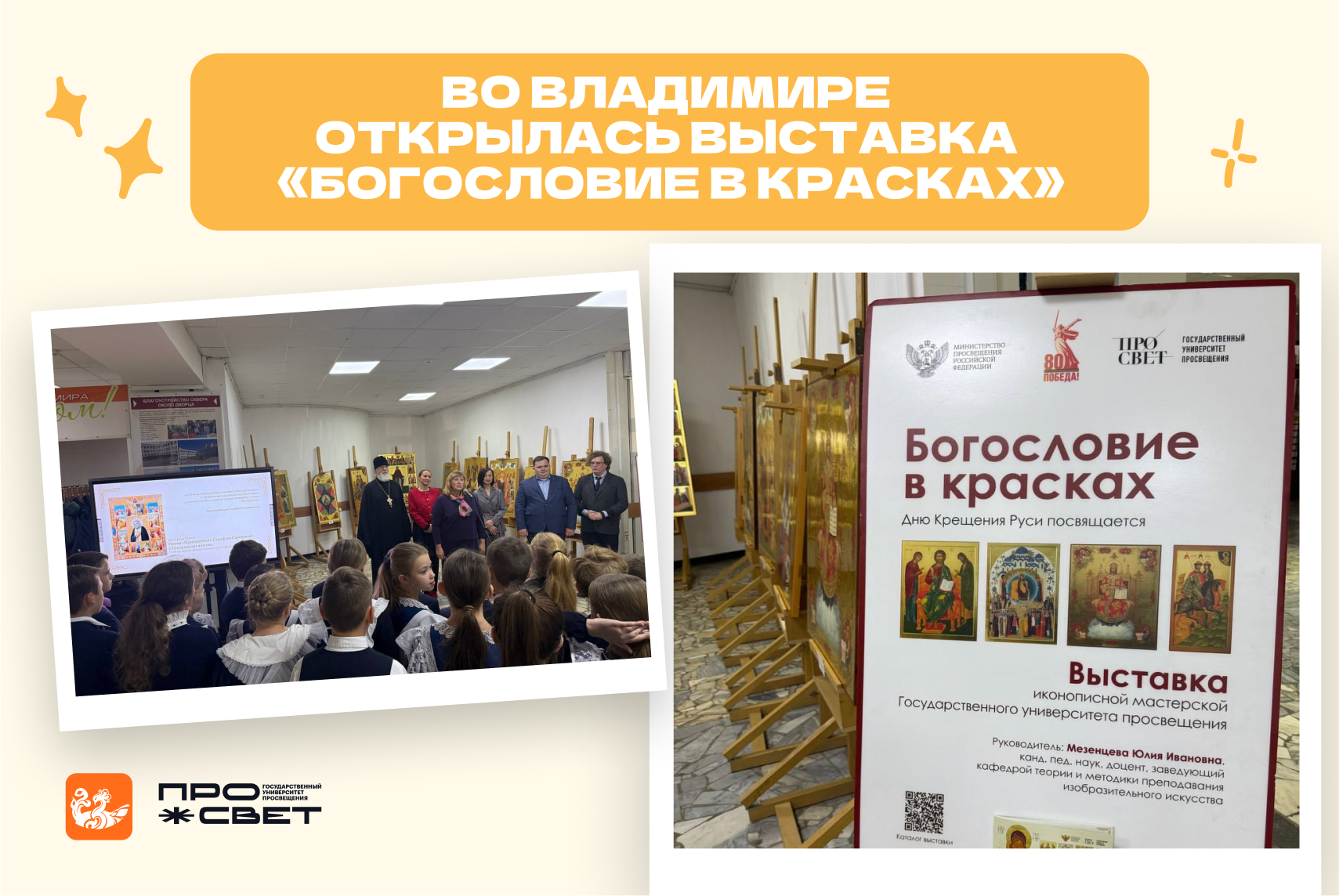 Во дворце детского юношеского творчества в городе Владимирначала работу передвижная выставка «Богословие в красках». В экспозиции можно увидеть уникальную коллекция работ, выполненных в иконописной мастерской факультета изобразительного искусства и народных ремёсел Университета, приуроченную к её 30-летнему юбилею и важному историческому событию — Крещению Руси.