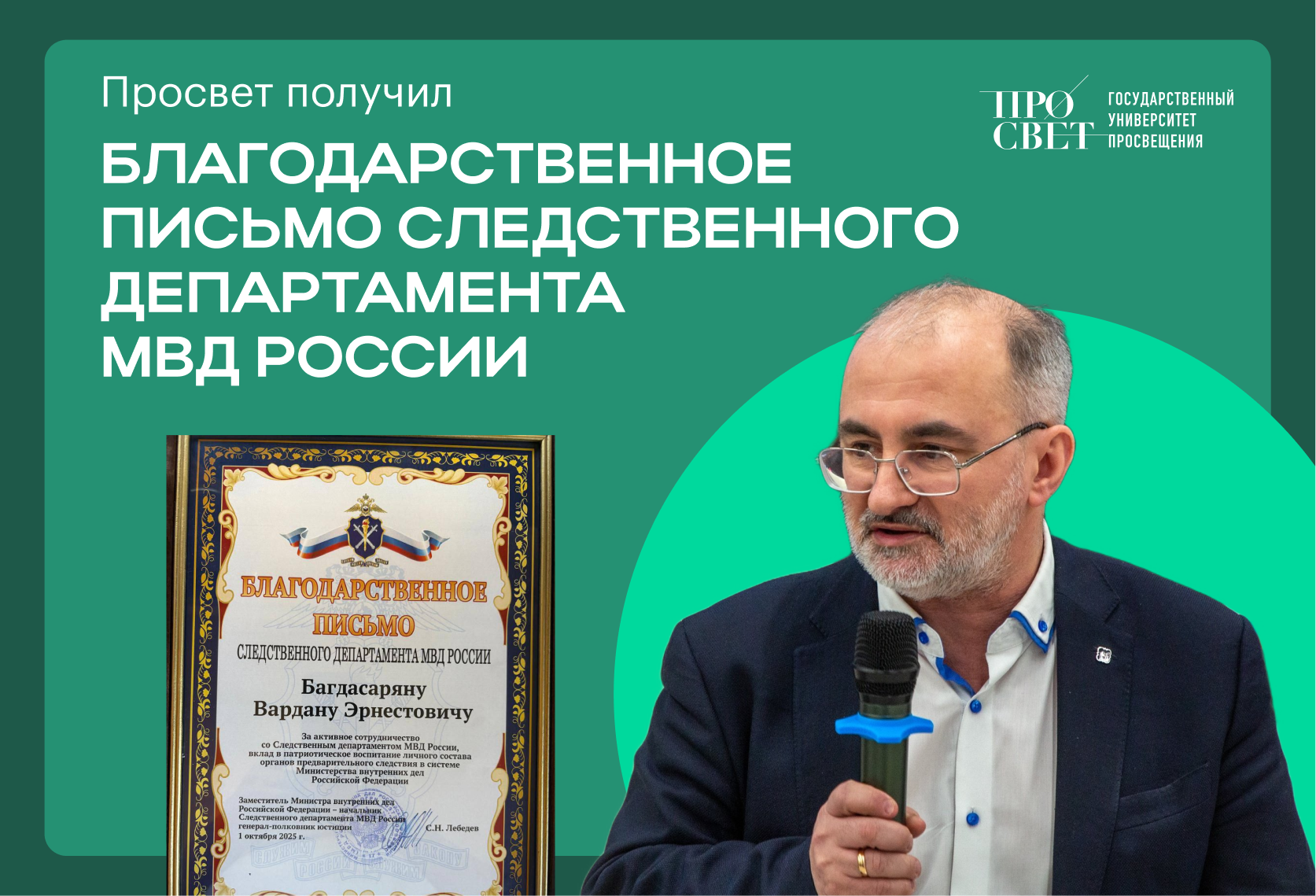 В знак признания совместной работы и вклада в патриотическое воспитание личного состава органов предварительного следствия декану факультета Вардану Эрнестовичу Багдасаряну вручено Благодарственное письмо Следственного департамента МВД России.