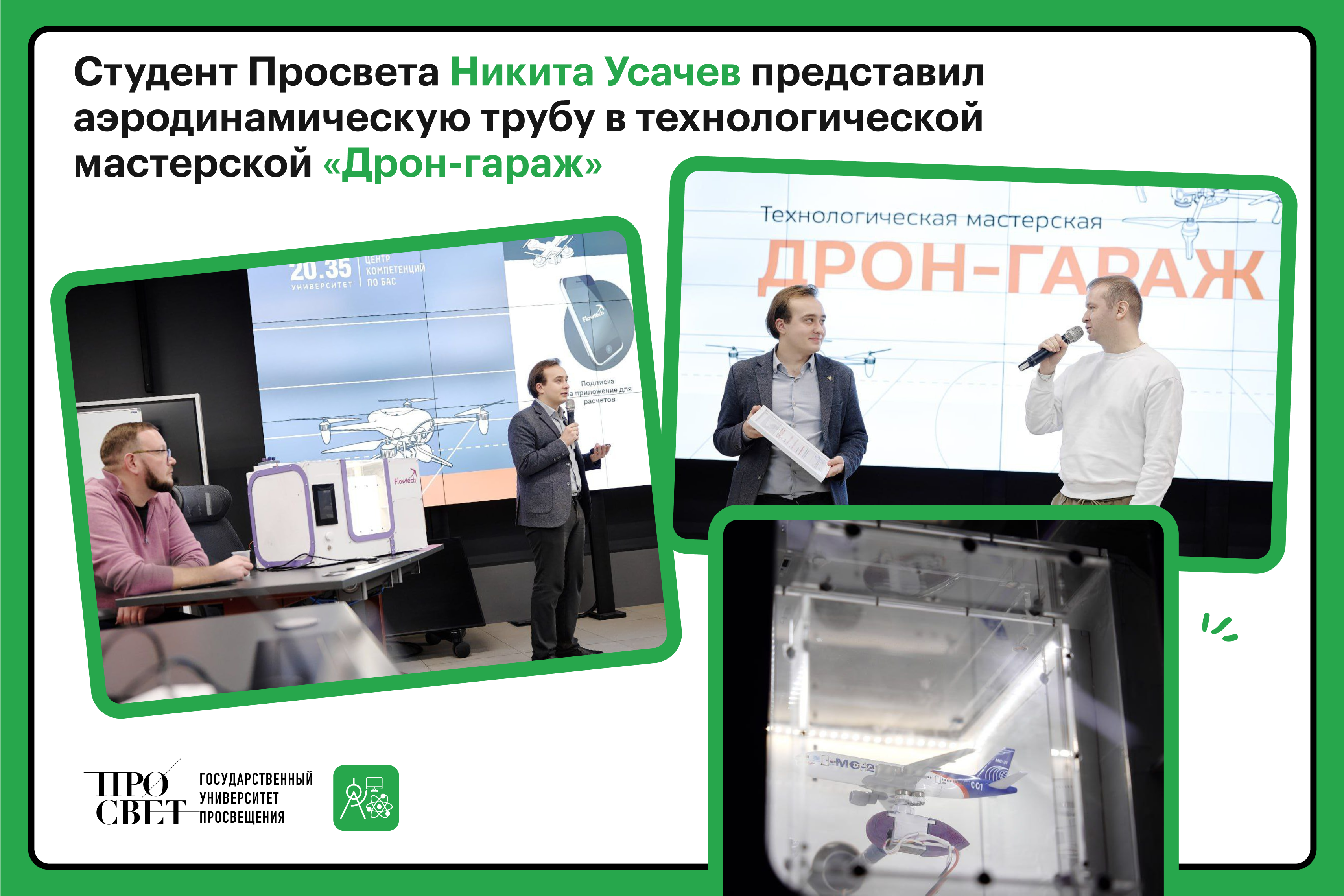 Студент 4 курса физико-математического факультета Университета просвещения Никита Усачев представил инновационную аэродинамическую трубу «Flowtech» в рамках тестирования авторской разработки в Технологической мастерской «Дрон-гараж».