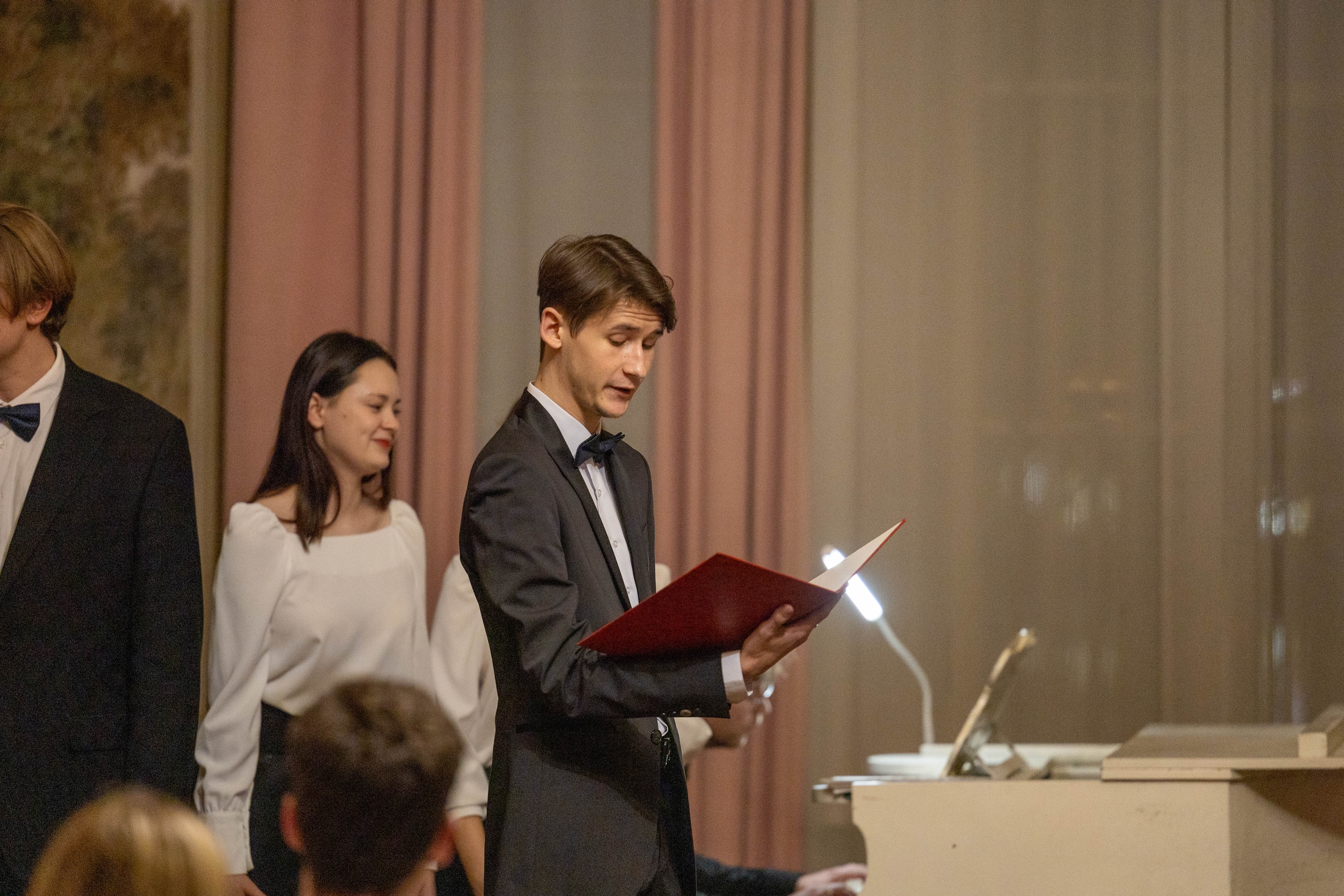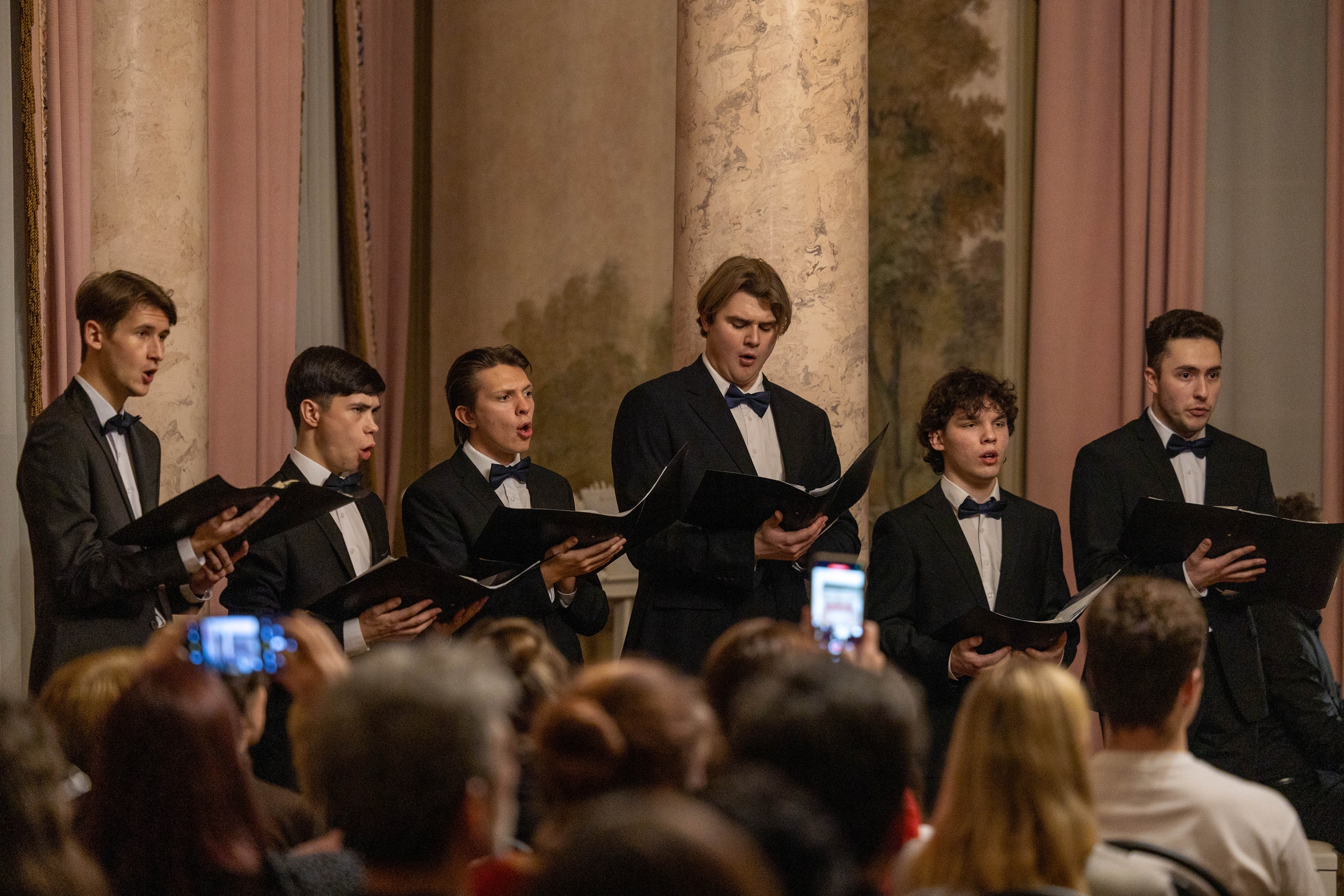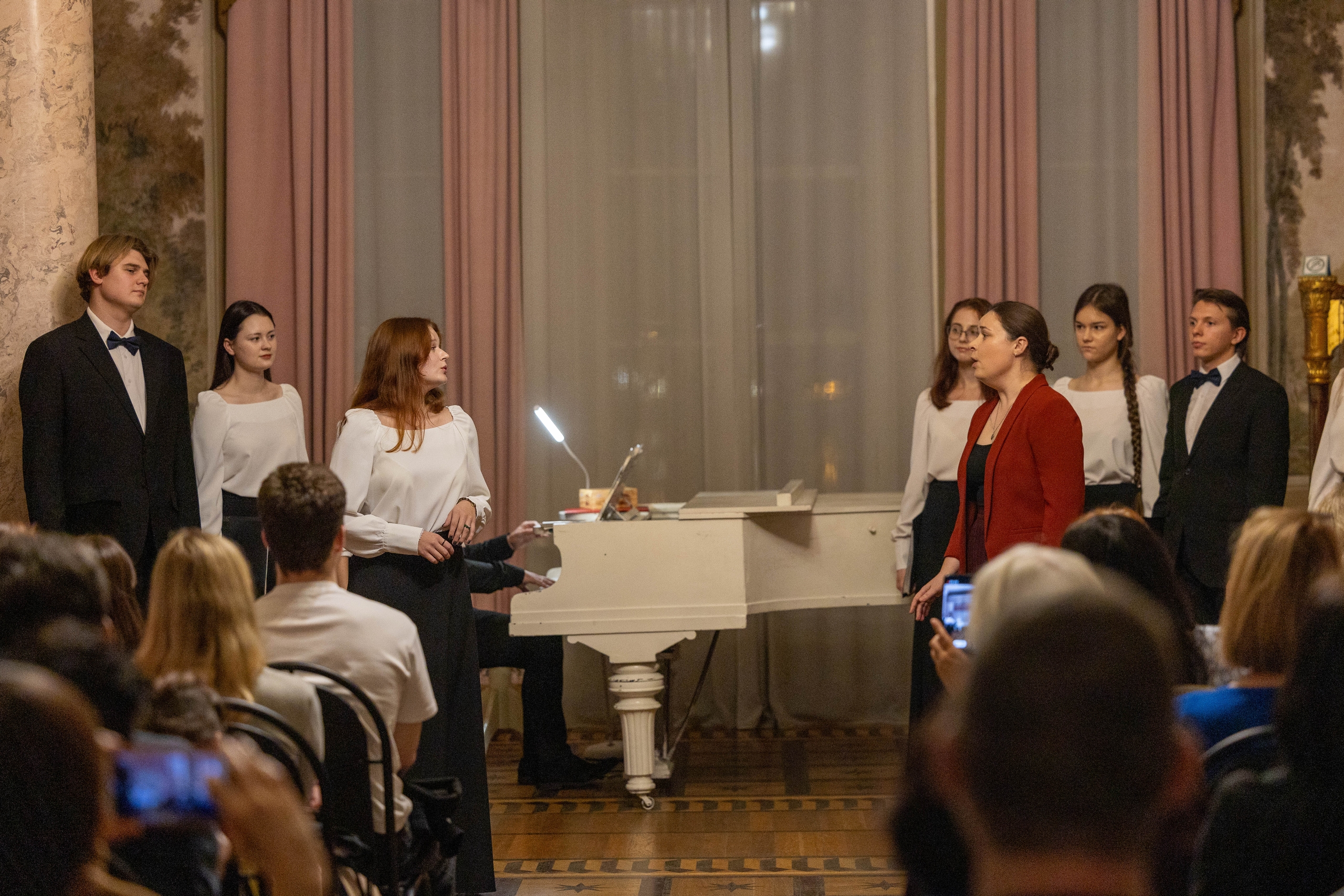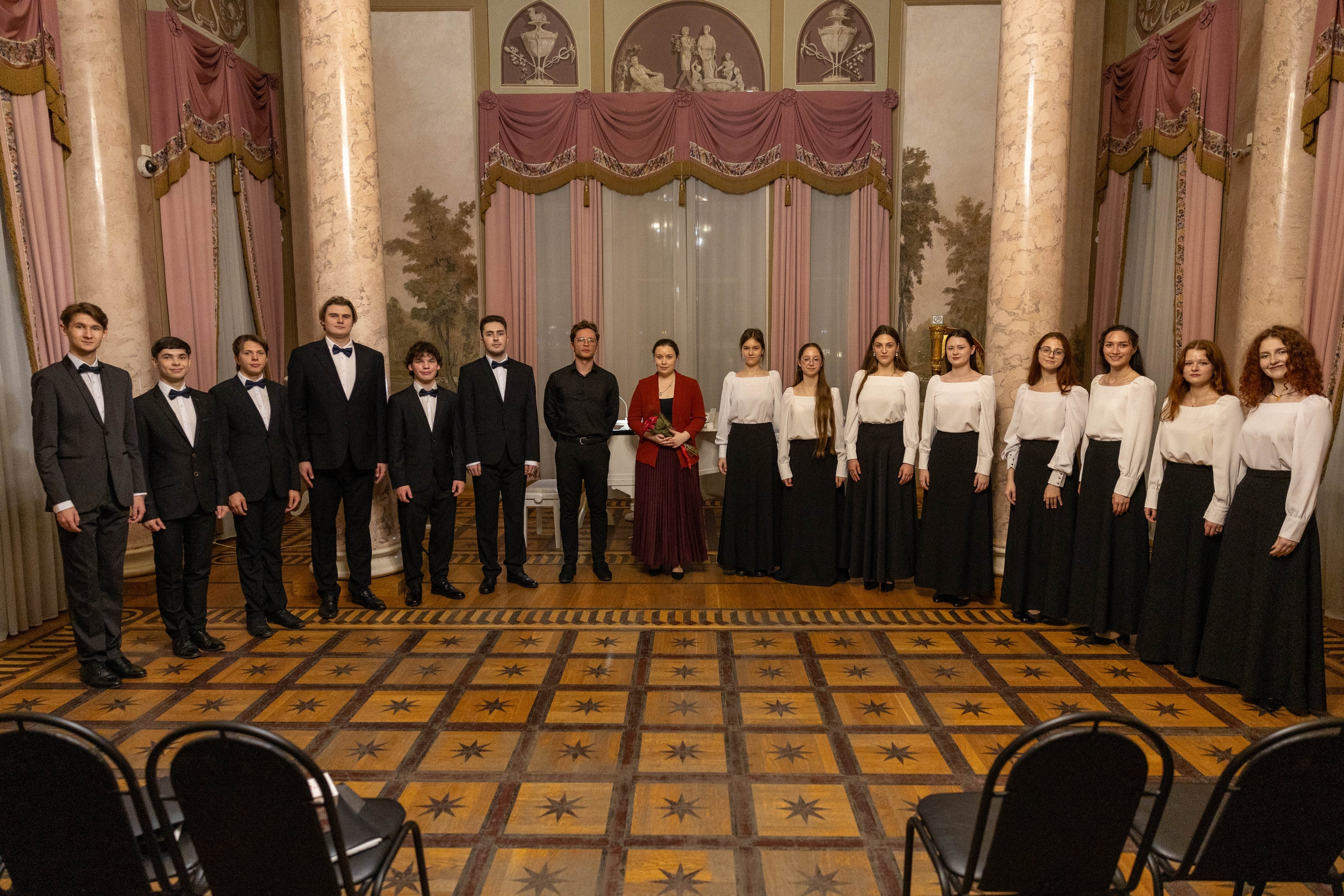 В парадной гостиной дворца прозвучали романсы Чайковского, Рахманинова, Римского-Корсакова, Глинки, Кюи, Власова, хоровая классика, дуэты и сольные номера.