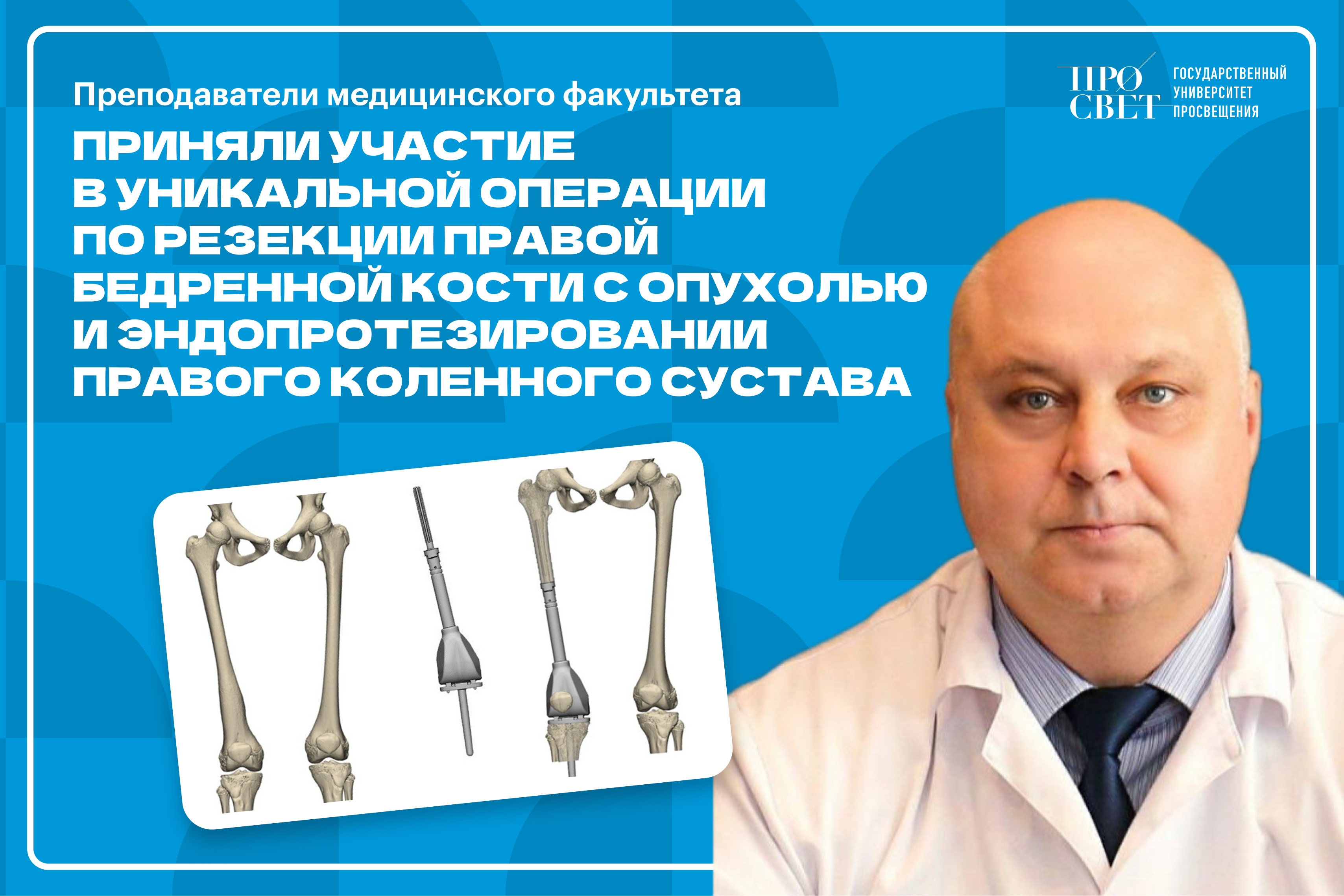 Команда кафедры хирургии медицинского факультета под руководством заведующего кафедрой, главного врача Московского областного онкологического диспансера Владимира Леонидовича Асташова приняла участие в уникальной операции — резекции правой бедренной кости с опухолью и эндопротезировании правого коленного сустава совместно с врачом-детским онкологом Морозовской детской городской клинической больницы Дмитрием Васильевичем Нисиченко.