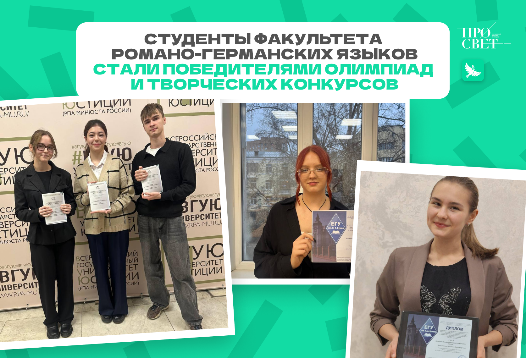 На IV Всероссийском конкурсе научно-исследовательских работ студенты факультета также проявили себя на высоком уровне. 1 места заняли Виктория Городяненко и Иван Ерехинский. 2 место получили Екатерина Орлова и Полина Носкова. 3 место присуждено Софье Рудиченко, Нине Мезенцевой, Гордею Журавлёву, Евгению Тупаеву, Яне Варанкиной, Анастасии Кшенниковой и Марии Носовой. Победы — это только начало! Просвет поздравляет своих студентов и верит в их будущие научные свершения!