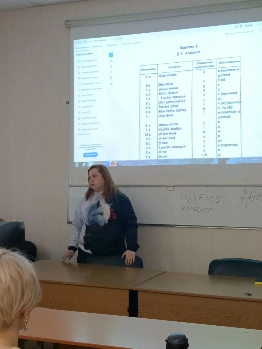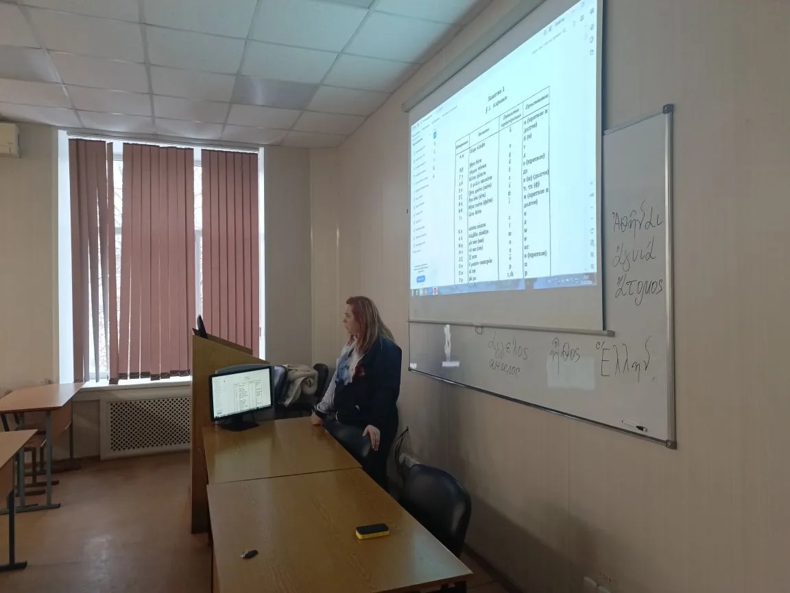 Профессор А.А. Балута показала пример греческого письма в варианте скорописи, который отличается от печатного варианта, рассказала об особенностях сочетания гласных и согласных, о значении диакритических знаков и знаков препинания. Научила читать слова на греческом языке с употреблением диакритиков и озвучила отрывок греческого текста.