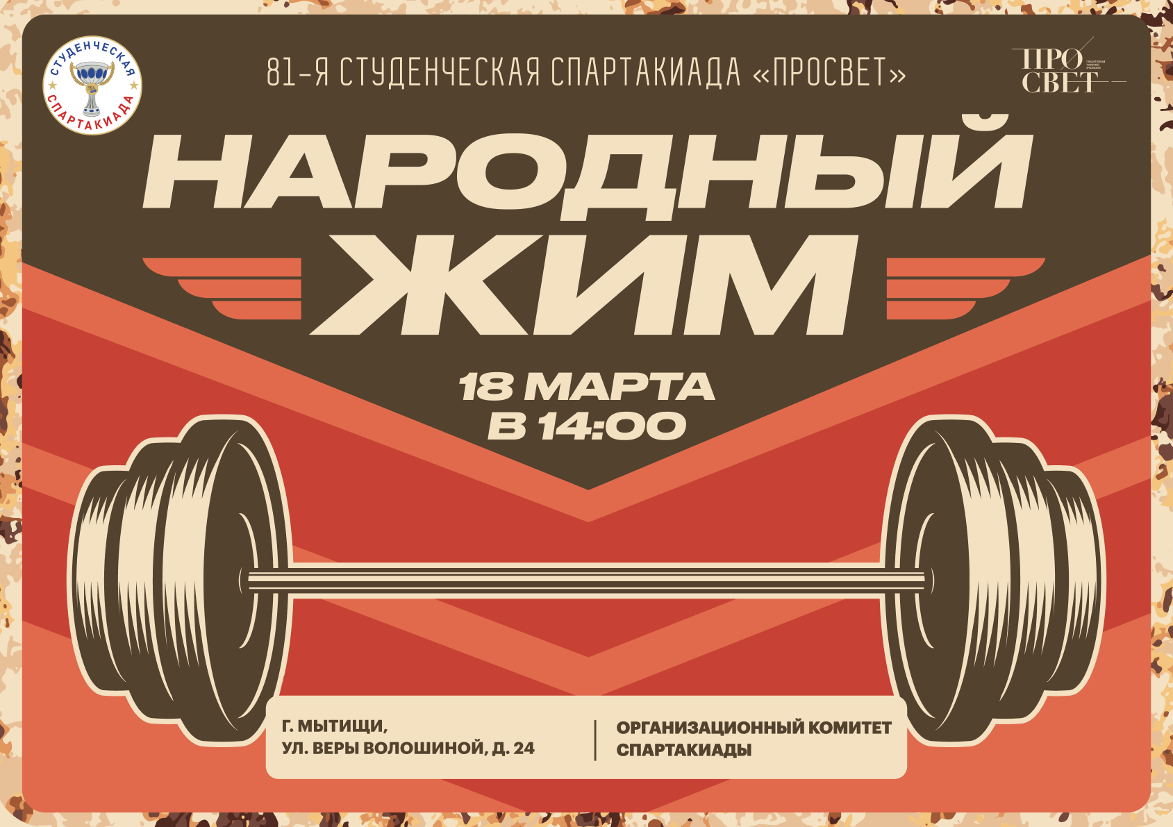 Приглашаем вас принять участие в соревнованиях по народному жиму. Собирайте команду с участием 2 девушек и 2 юношей от факультета! Максимальный вес штанги для девушек — 25 кг, для юношей — 40 кг.
