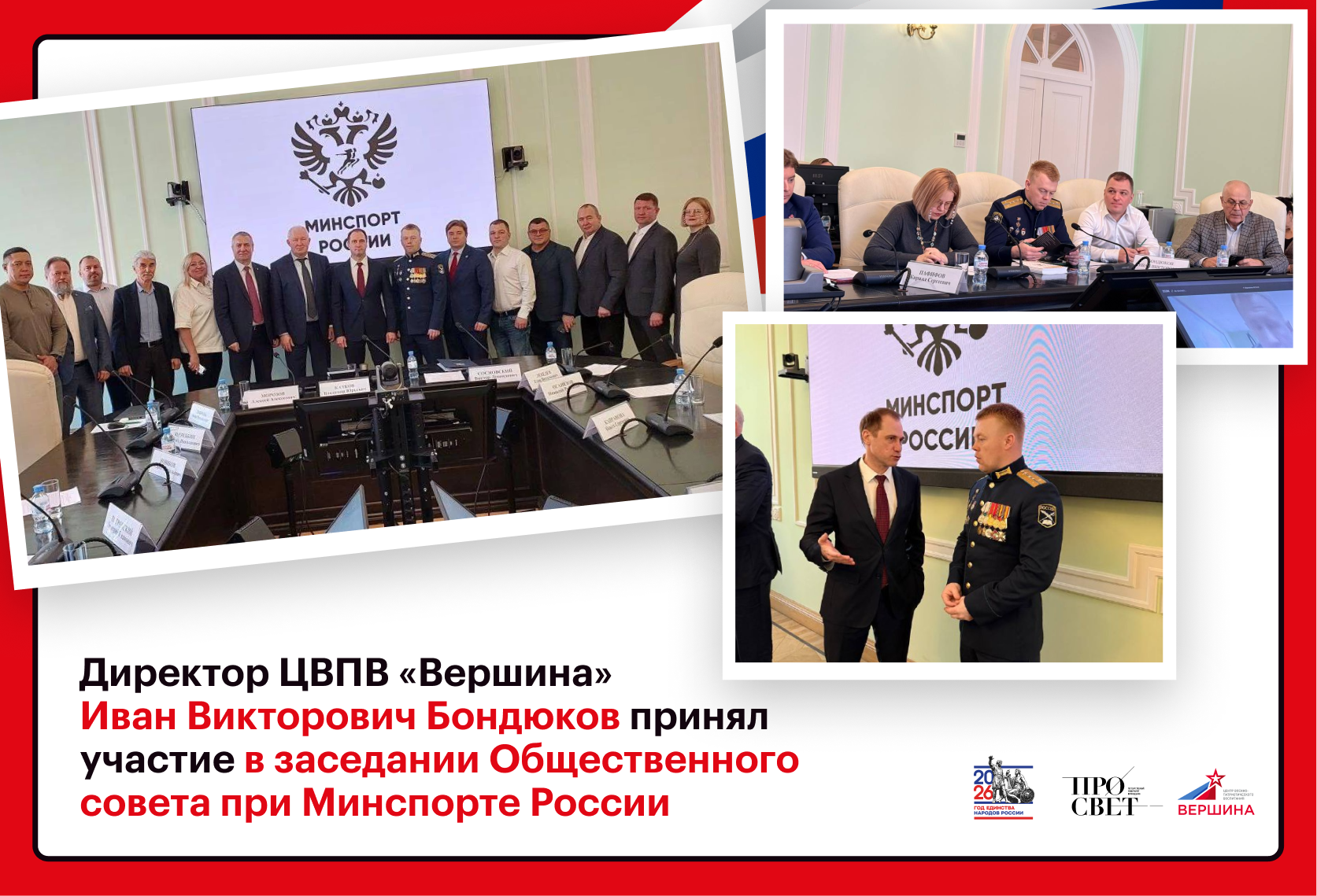 Иван Викторович Бондюков — директор Центра военно-патриотического воспитания «Вершина», созданного по инициативе Минпросвещения России, принял участие в заседании Общественного совета при Минспорте России. Главной темой встречи стало патриотическое воспитание в детско-юношеском спорте.