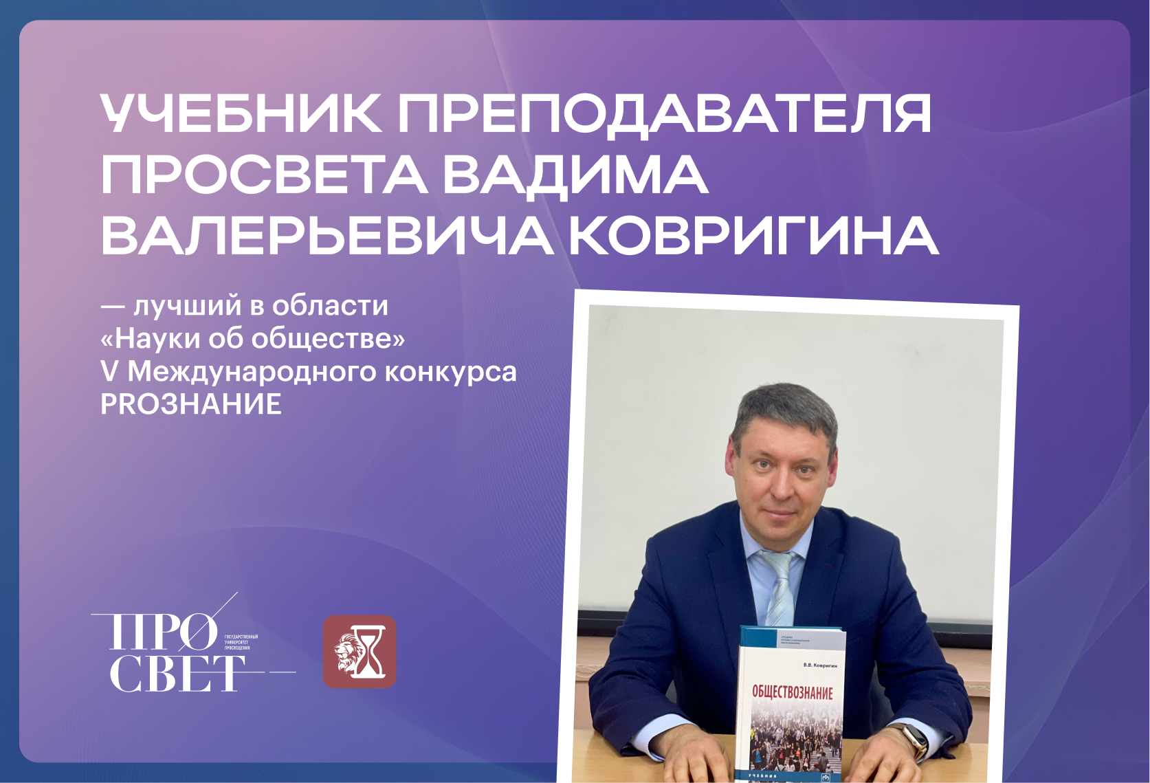 Учебник «Обществознание» заведующего кафедрой методики преподавания истории и обществознания Вадима Валерьевича Ковригина по итогам V Международного конкурса PROЗНАНИЕ стал лучшим в номинации «Электронные книги. Самый читаемый электронный учебник».