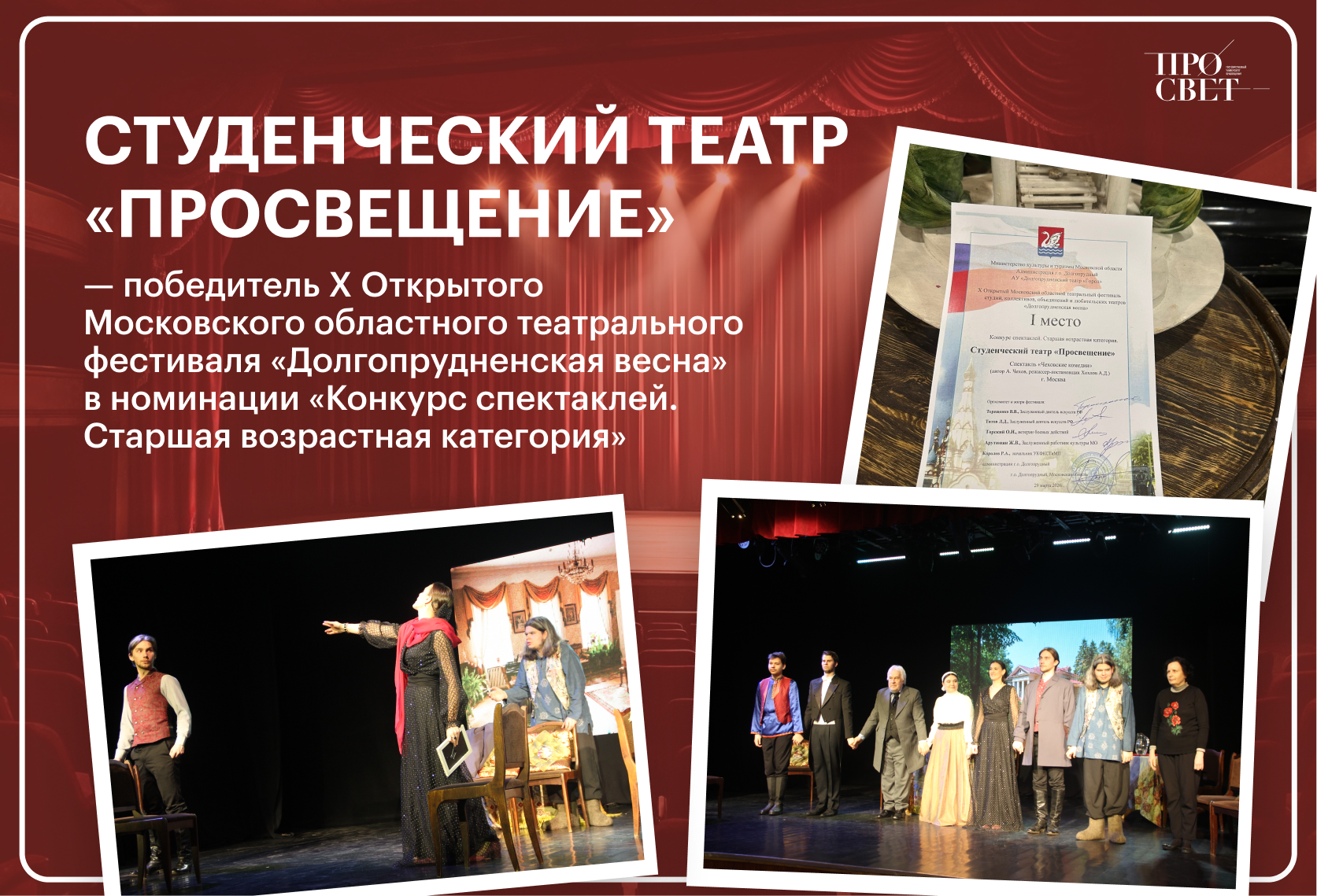Студенческий театр «ПРОСВЕЩЕНИЕ» стал победителем X Открытого Московского областного театрального фестиваля студий, коллективов, объединений и любительских театров «Долгопрудненская весна» в номинации «Конкурс спектаклей. Старшая возрастная категория».