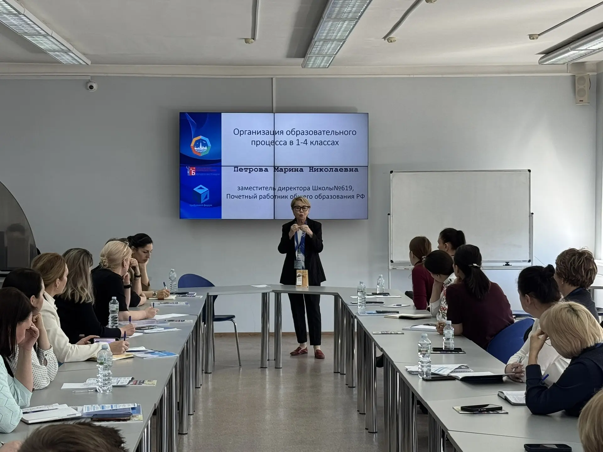 Исполняющий обязанности директора школы № 619, Заслуженный учитель Российской Федерации Марина Нечаева рассказала участникам о том, как выстроена образовательная модель крупной школы-комплекса. Заместитель директора Александра Тарновская подискутировала со слушателями на тему «Голос детей: возраст смыслов и замыслов». Марина Петрова, заместитель директора, Почетный работник общего образования Российской Федерации, осветила вопросы организации образовательного процесса в начальной школе.
