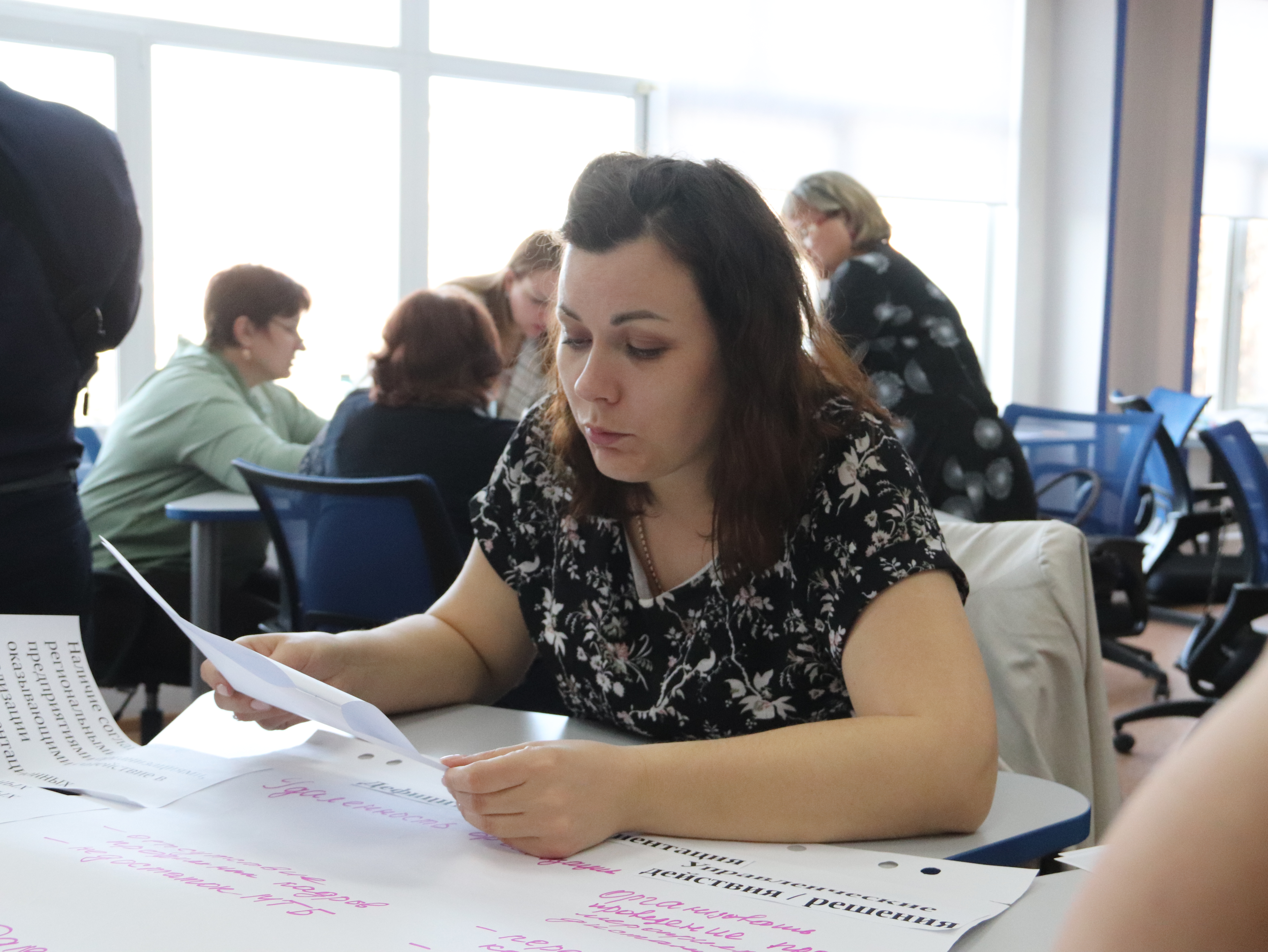 Работа была интенсивной: команды генерировали идеи, предлагали решения, обсуждали алгоритмы, разбирали кейсы и выстраивали логику своих будущих программ. Особое внимание уделили таким сложным характеристикам, как проектность, контролируемость и структурность документа.