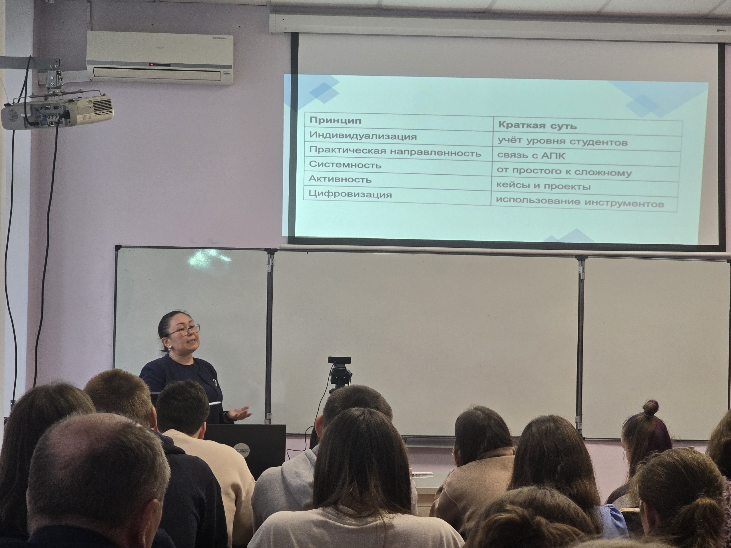 С докладом «Дидактические принципы вариативного обучения математике в аграрном образовании в условиях цифровизации АПК» выступила Жаныс Арай Бошанкызы, доцент кафедры высшей математики Института экономики и управления АПК Российского государственного аграрного университета – МСХА имени К.А. Тимирязева.