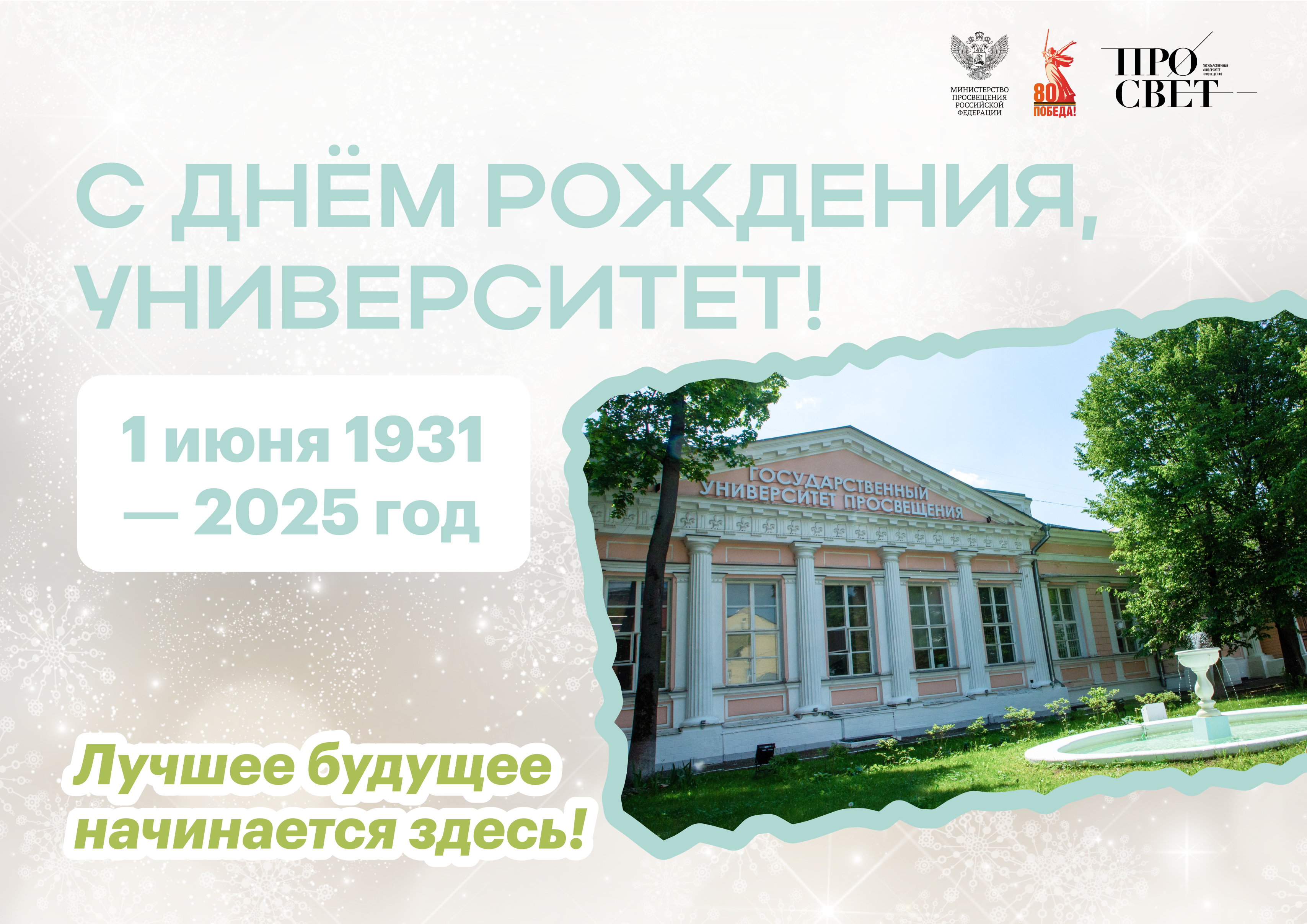 Дорогие студенты, аспиранты, преподаватели, сотрудники, ветераны и выпускники Государственного университета просвещения!Сегодня нашему Университету исполняется 94 года! С 1931 года это кузница педагогических, научных, управленческих, спортивных кадров!Государственный университет просвещения занимает 7 место в предметном рейтинге вузов России по специальности «Педагогическое образование». Просвет — это 10000 студентов, 14 факультетов, 1500 ведущих преподавателей и сотрудников. Сегодня Университет выбирают молодые люди из 89 регионов Российской Федерации и 47 стран мира: СНГ, Китая, Африки, Латинской Америки и многих других.Ключевые партнёры Государственного университета просвещения — Российское общество «Знание», Российское военно-историческое общество, Российское движение детей и молодёжи «Движение первых», Центр военно-спортивной подготовки и патриотического воспитания молодёжи «Воин», платформа «Россия — страна возможностей», Центр знаний «Машук», субъекты региональной и муниципальной власти и другие.Просвет гордится 24 научными школами и научно-образовательными центрами Подмосковья, которые проводят исследования по приоритетным направлениям, славятся своими достижениями и преемственностью. Институт повышения квалификации и профессиональной переподготовки Университета реализует десятки программ повышения квалификации для действующих педагогов. Центр военно-патриотического воспитания «Вершина» при поддержке Минпросвещения России проводит обучение участников Специальной военной операции. Просвет взаимодействует с международными организациями и всероссийскими детскими центрами «Артек», «Орлёнок», «Алые паруса», «Океан» и многими другими, уделяя большое внимание подготовке будущих вожатых, специалистов по работе с детьми и молодёжью.Университет славится Студенческим театром «ПРОСВЕЩЕНИЕ», вокально-хоровым ансамблем «Знак» и коллективом «PolyAna», которые представляют Университет на всероссийских и международных конкурсах, талантливыми участниками фестивалей «Студенческая весна» в Москве и Подмосковье. Наши волонтёры работают в новых регионах России, поддерживая участников СВО и мирных жителей, участвуют в экологических акциях и готовы прийти на помощь в любую минуту. Особые слова благодарности нашим ветеранам — хранителям традиций и наставникам!Поздравляем Университет с днём рождения нашего любимого вуза и желаем творческой самореализации, новых проектов и достижений, взаимопонимания в семьях и мирного неба над головой!Коллектив Государственного университета просвещения