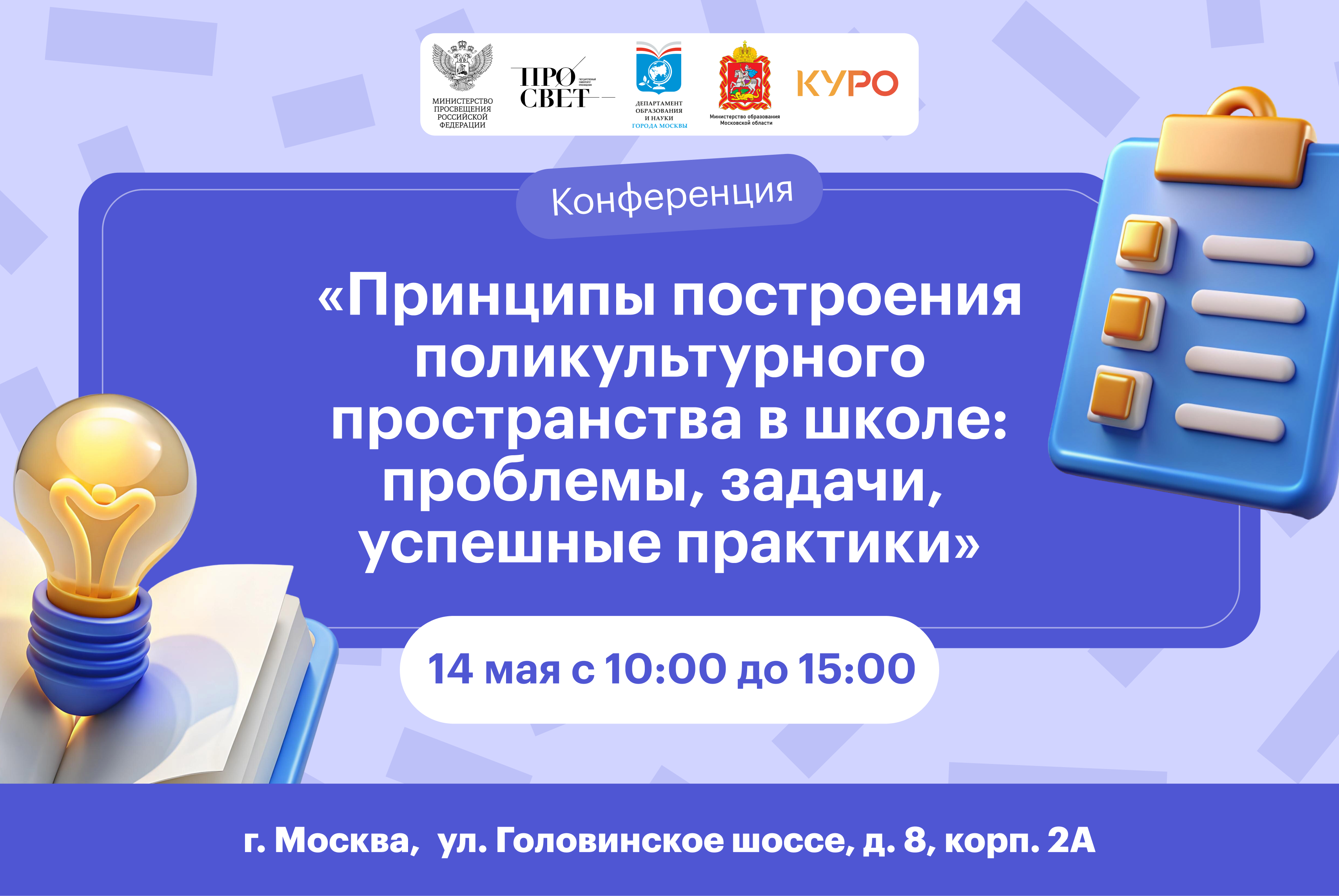 Спешим напомнить, что уже скоро в Просвете пройдёт Всероссийская научно-практическая конференция «Практические подходы к построению поликультурного пространства в школе: проблемы, задачи, успешные практики». Мероприятие состоится при поддержке Минпросвещения, Департамента образования и науки города Москвы, Министерства образования Московской области и Корпоративного университета развития образования.Экспертная площадка объединит учёных, педагогов-практиков, преподавателей вузов, методистов, психологов и представителей общественных организаций Они обсудят, как эффективно обучать детей-инофонов и развить профессиональные компетенции учителей.До встречи: 14 мая с 10:00 до 15:00;г. Москва, Головинское шоссе, д.8, корп. 2А.Узнайте о мероприятии больше в программе! Не упустите возможность познакомиться с лучшими образовательными практиками #ГосударственныйУниверситетПросвещения