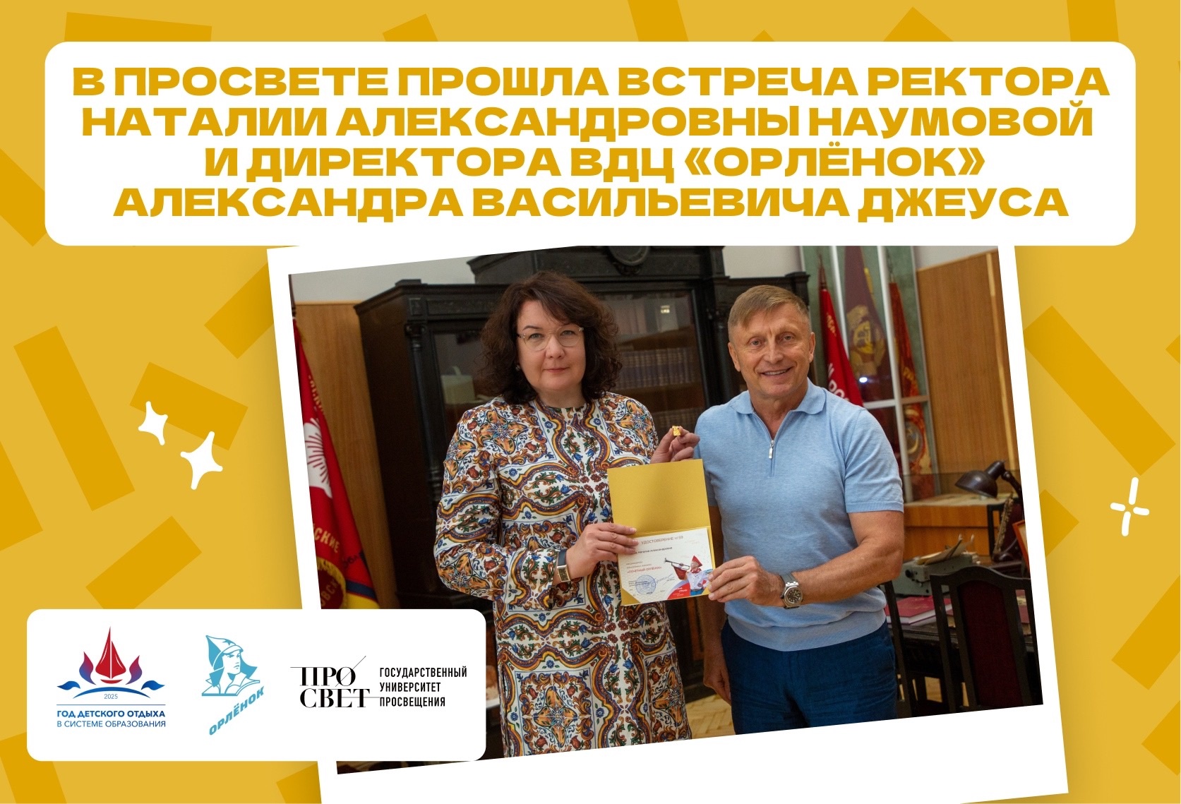 Торжественным моментом встречи стало вручение Наталии Александровне Наумовой знака «Почётный Орлёнок», посвящённого 65-летнему юбилею детского центра. Он символизирует плодотворное сотрудничество ведущих организаций системы