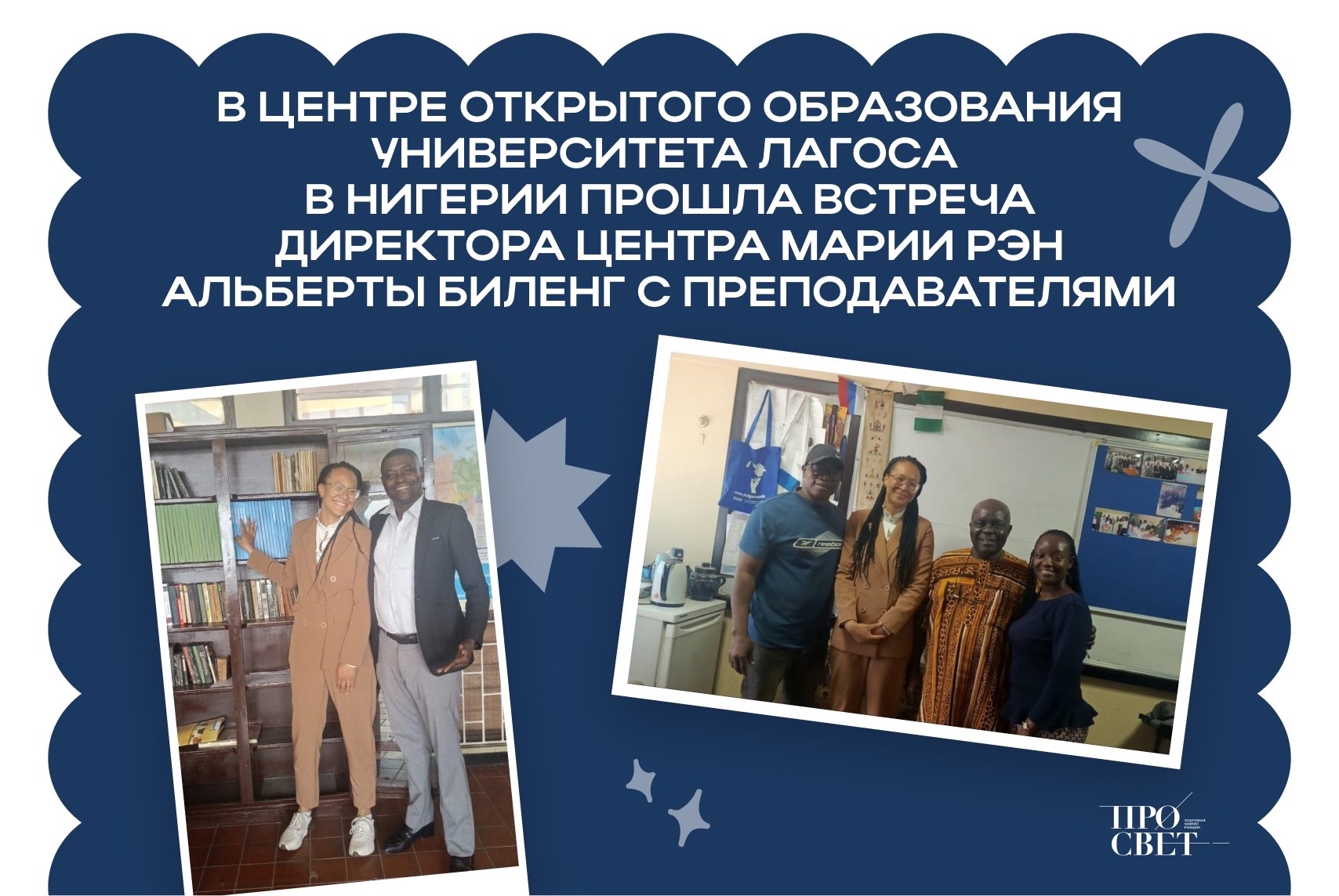В Центре открытого образования на базе Университета Лагоса в Нигерии прошла встреча директора Центра Марии Рэн Альберты Биленг с преподавателем русского языка — доктором Джоном Фалоджи и представителями вуза.