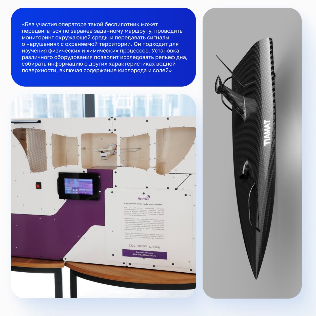 Кроме того, студент успел реализовать проект аэродинамической трубы FlowTech. Она позволяет проводить учебные опыты и эксперименты, тестировать малогабаритные беспилотники и модели летательных аппаратов прямо в учебном классе, что делает процесс обучения более наглядным и интересным.